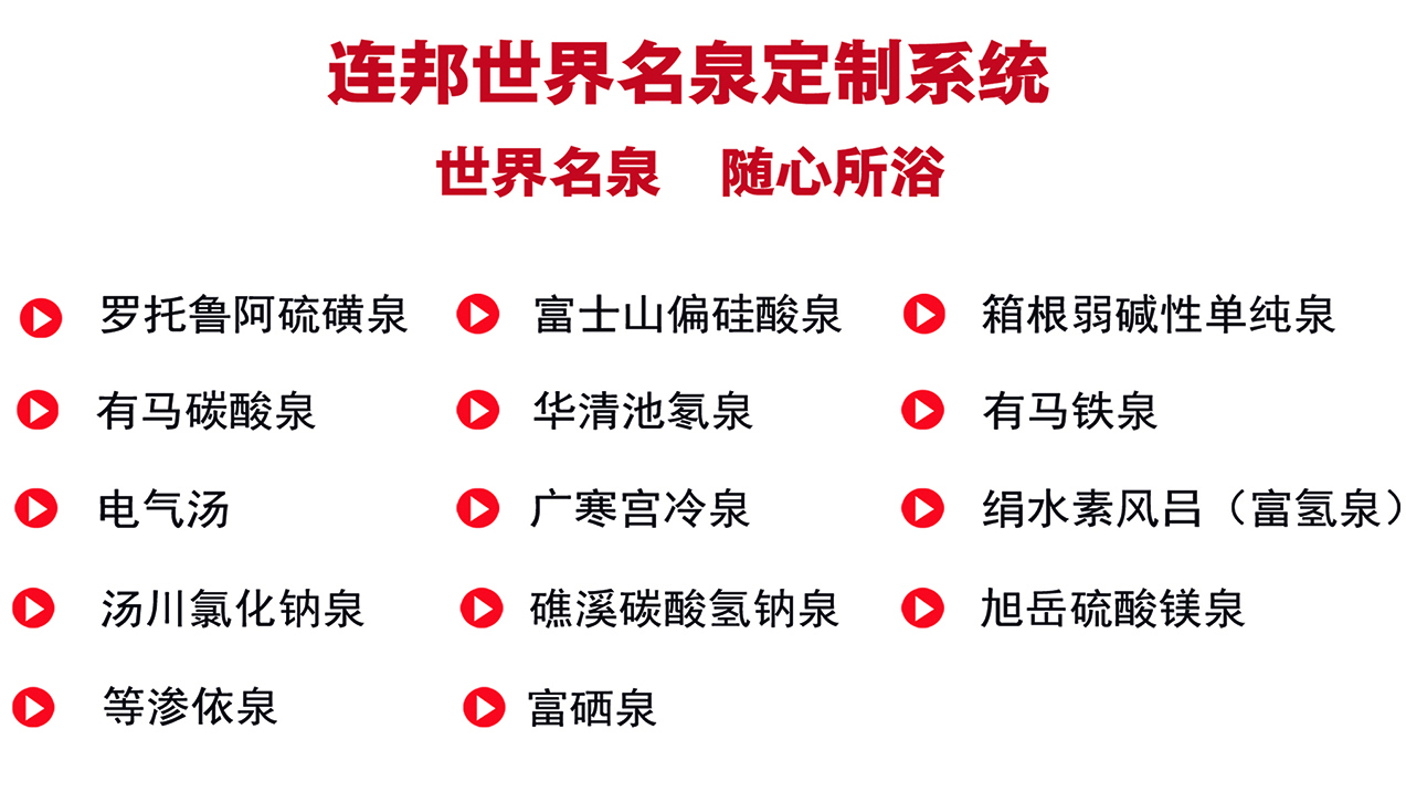 國內眾多都市溫泉企業引入連邦溫泉科技人工智能溫泉設備(也叫溫泉生成器或溫泉制造機),打造日式大健康療養模式,其中如閭山大朝陽溫泉山城、杭州海茵匯、長春九州溫泉會館、鞍山千山溫泉水上樂園等等,這些聞名遐邇的高品質溫泉經營地所涌動的溫泉水均來自連邦LBH人工溫泉設備,泉水中富含多種有益人體的元素,且元素含量遠超同類標準,擁有較高的養生康養價值。另外,其世界名泉定制系統涵蓋全球14種溫泉泉種,卓越的療養功效更是有口皆碑,足以成為溫泉經營中的一大火熱賣點,成功吸引越來越多的外地與本地游客前來旅游消費。