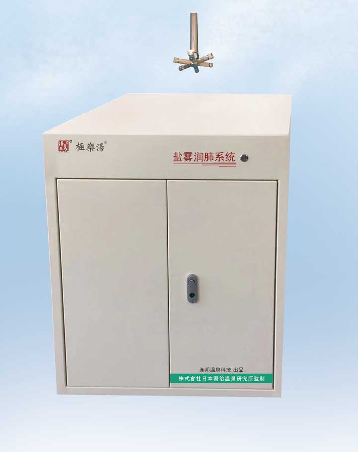 *原理:鹽霧潤肺系統采用連邦溫泉科技獨創的多介質水處理汗蒸技術,利用霧化療法的原理,將含有溫泉礦物質微霧水滴破解成直徑不到1微米的細微水粒子,配合3-5微米特精海鹽與純凈水科學配比的鹽霧水微粒進行全身及呼吸霧化。