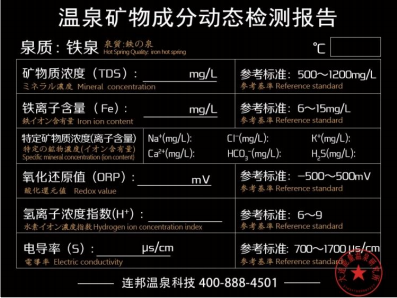 “天然溫泉再生系統”通過五大智能系統(溫泉監測系統、控制系統、驅動系統、識別系統和執行機構)對泡池中水的礦物質濃度、ORP、PH等水環境數據實現全自動精準控制和顯示,且水質檢測報告完全符合國家水質檢測標準。